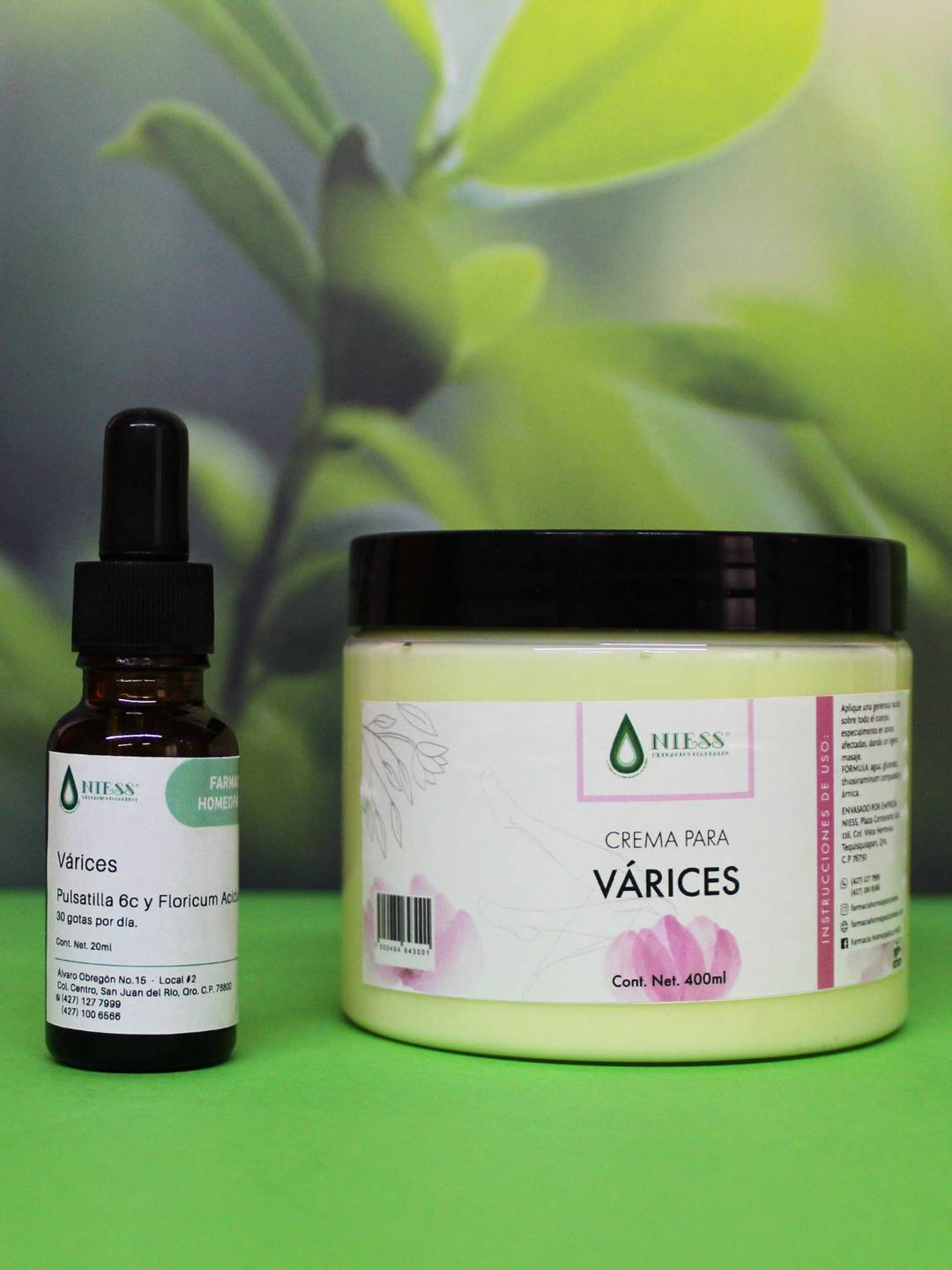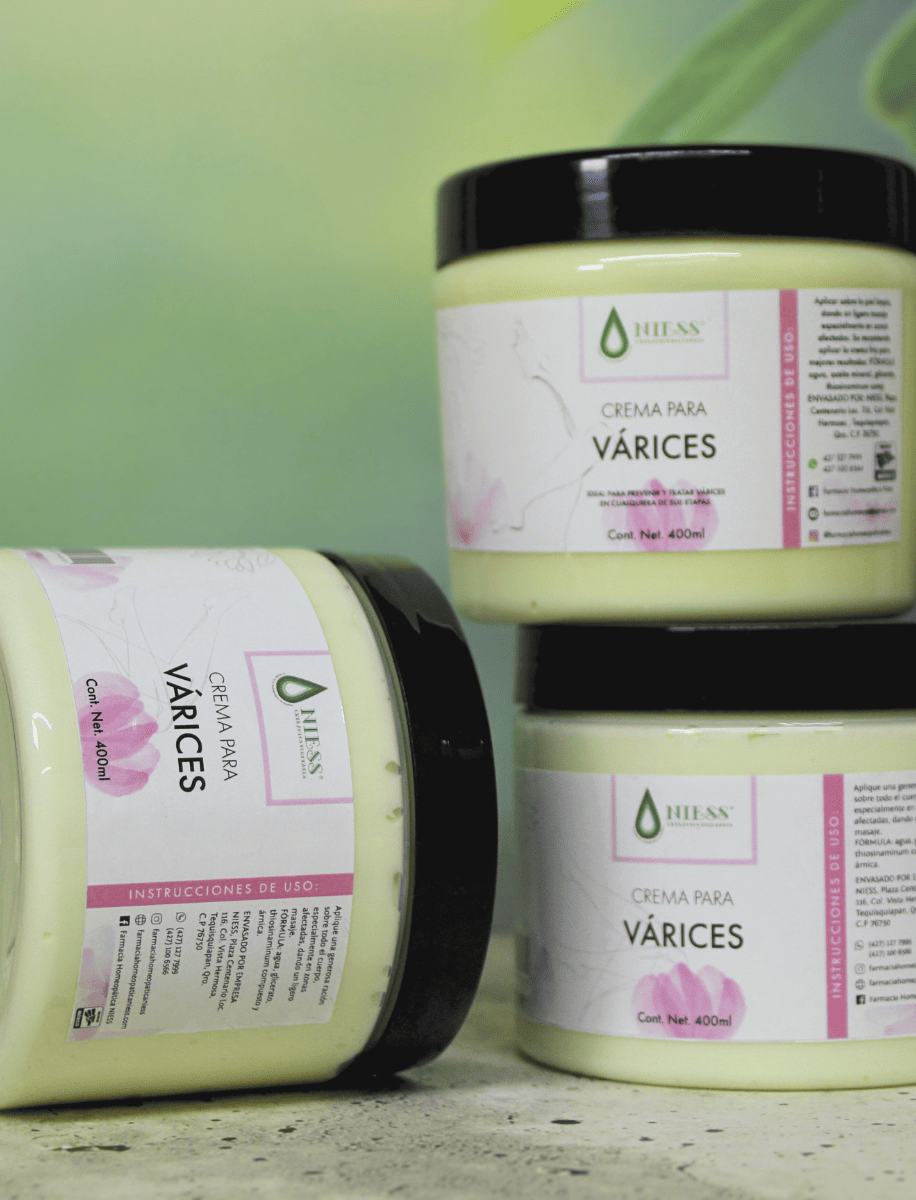 Crema para varices: Agua, glicerato, extracto de manzanilla, thiosinaminum compuesto, árnica.
